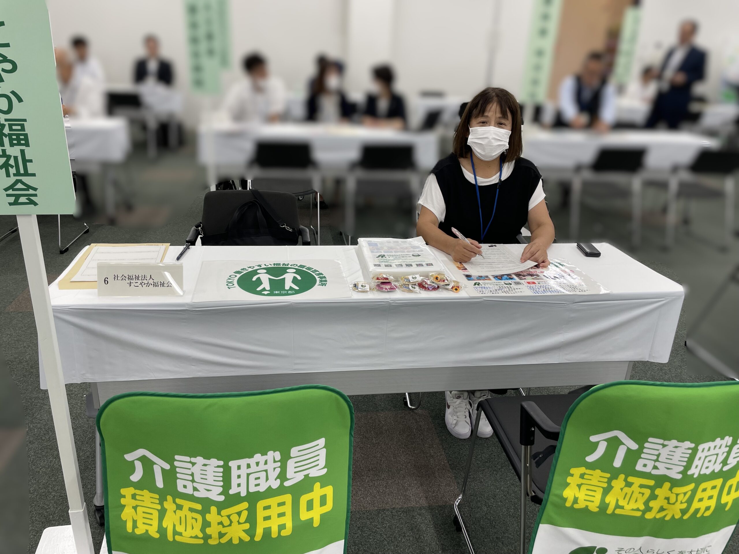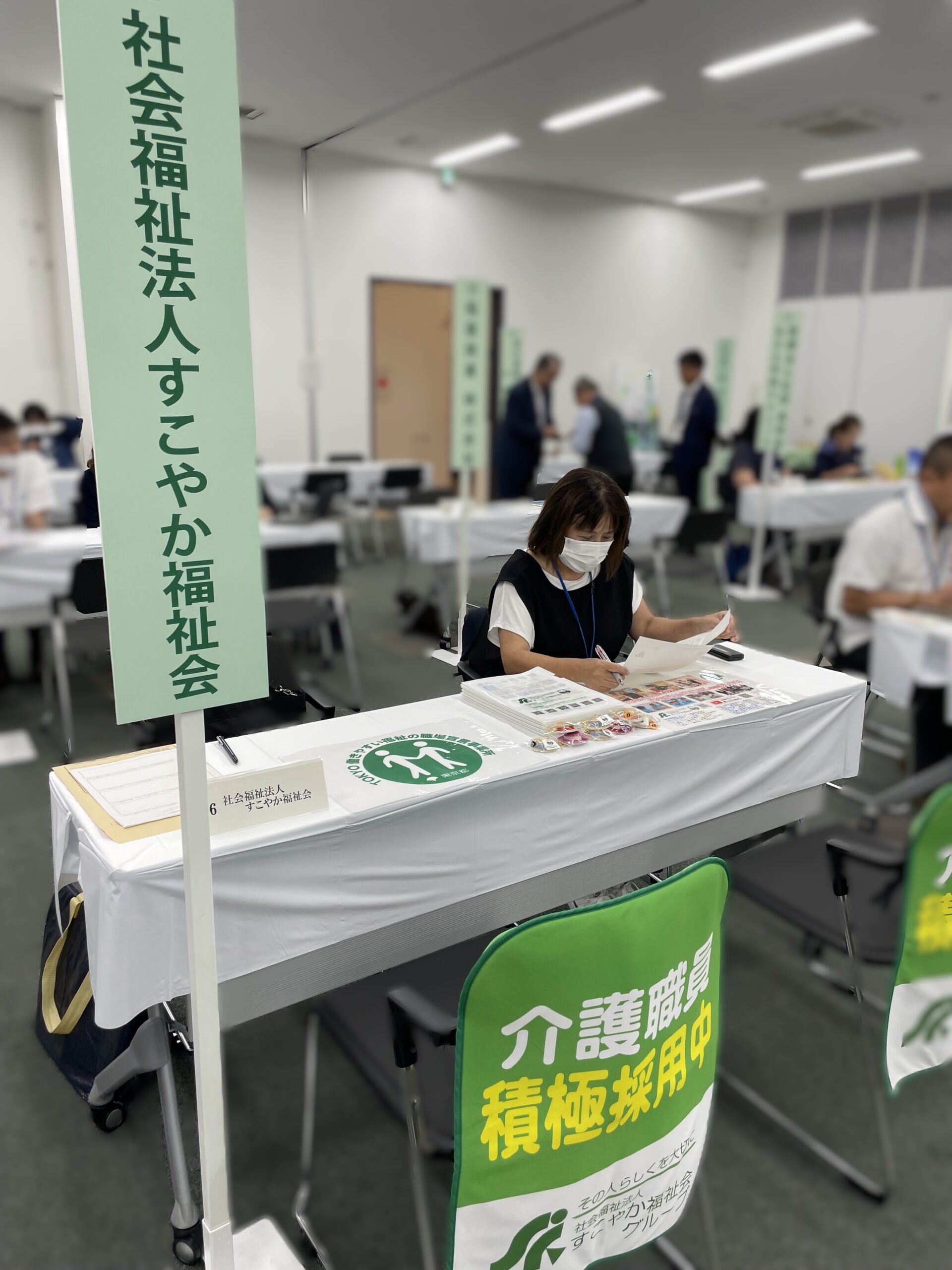 相談会には32社のブースが並び、事前登録制の上で2名の方がすこやか福祉会を訪問してくださいました。