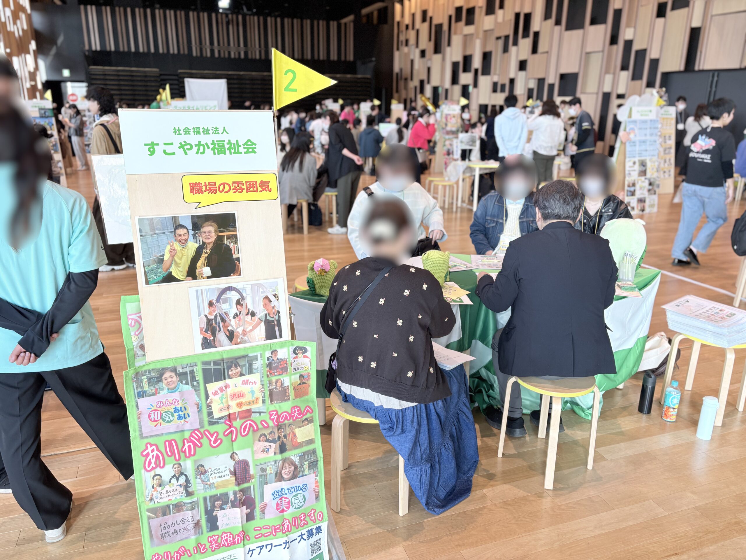 私たち社会福祉法人すこやか福祉会も、「笑顔でなが~く働き続けられるワケがあります!」をキーワードにブース出展し、東京都・埼玉県・千葉県での高齢福祉・医療分野での取り組みについてお話ししました。