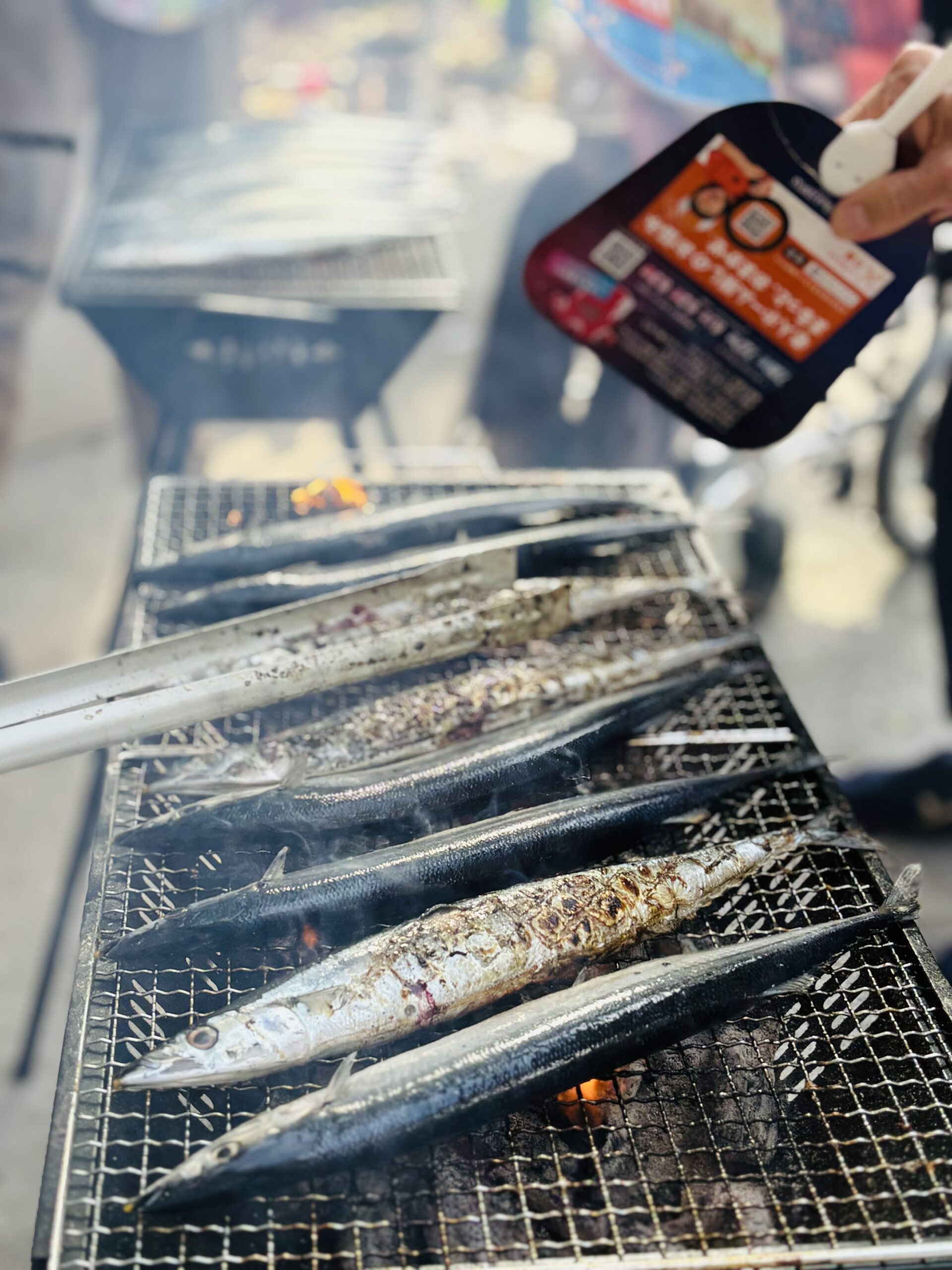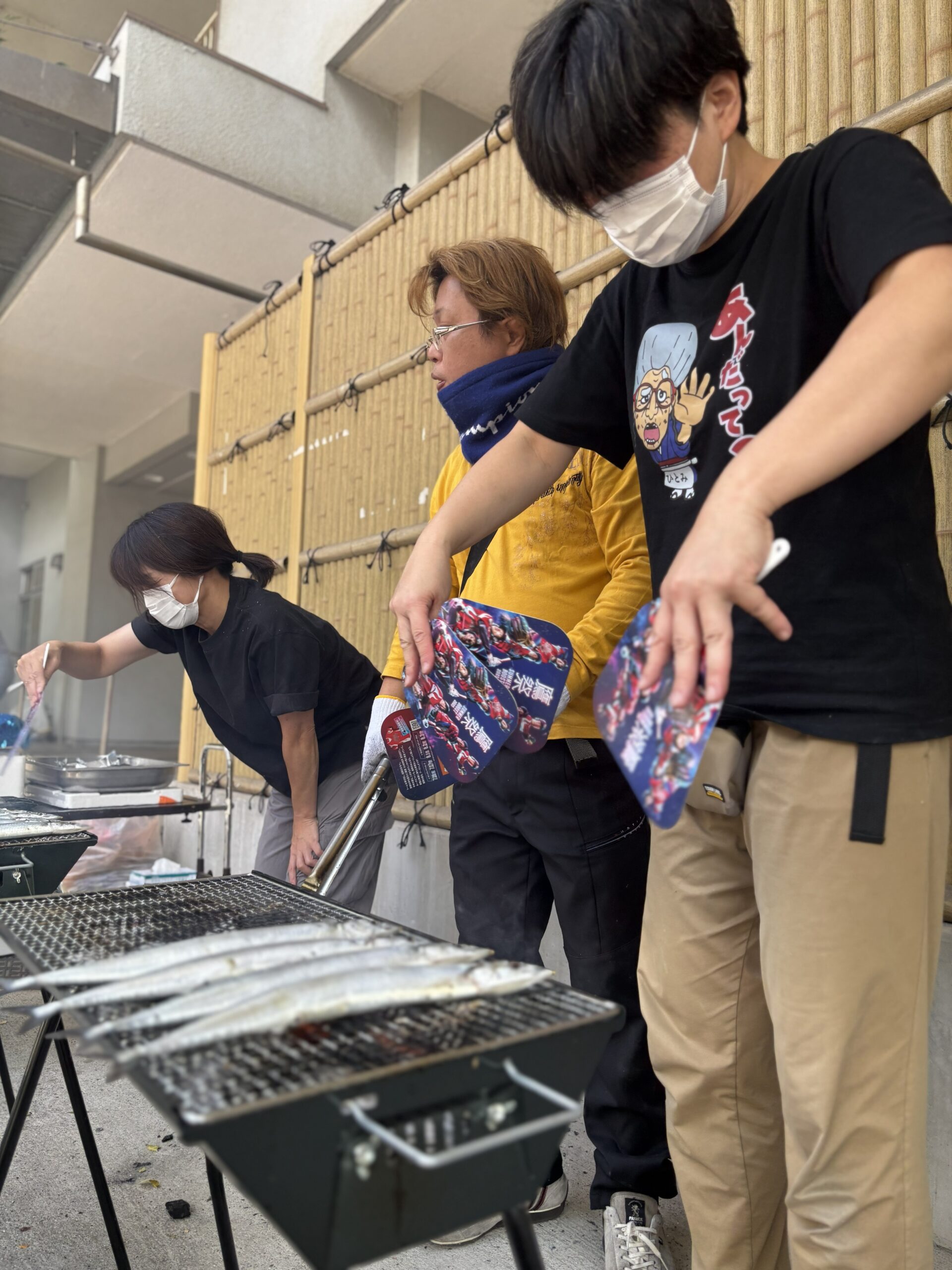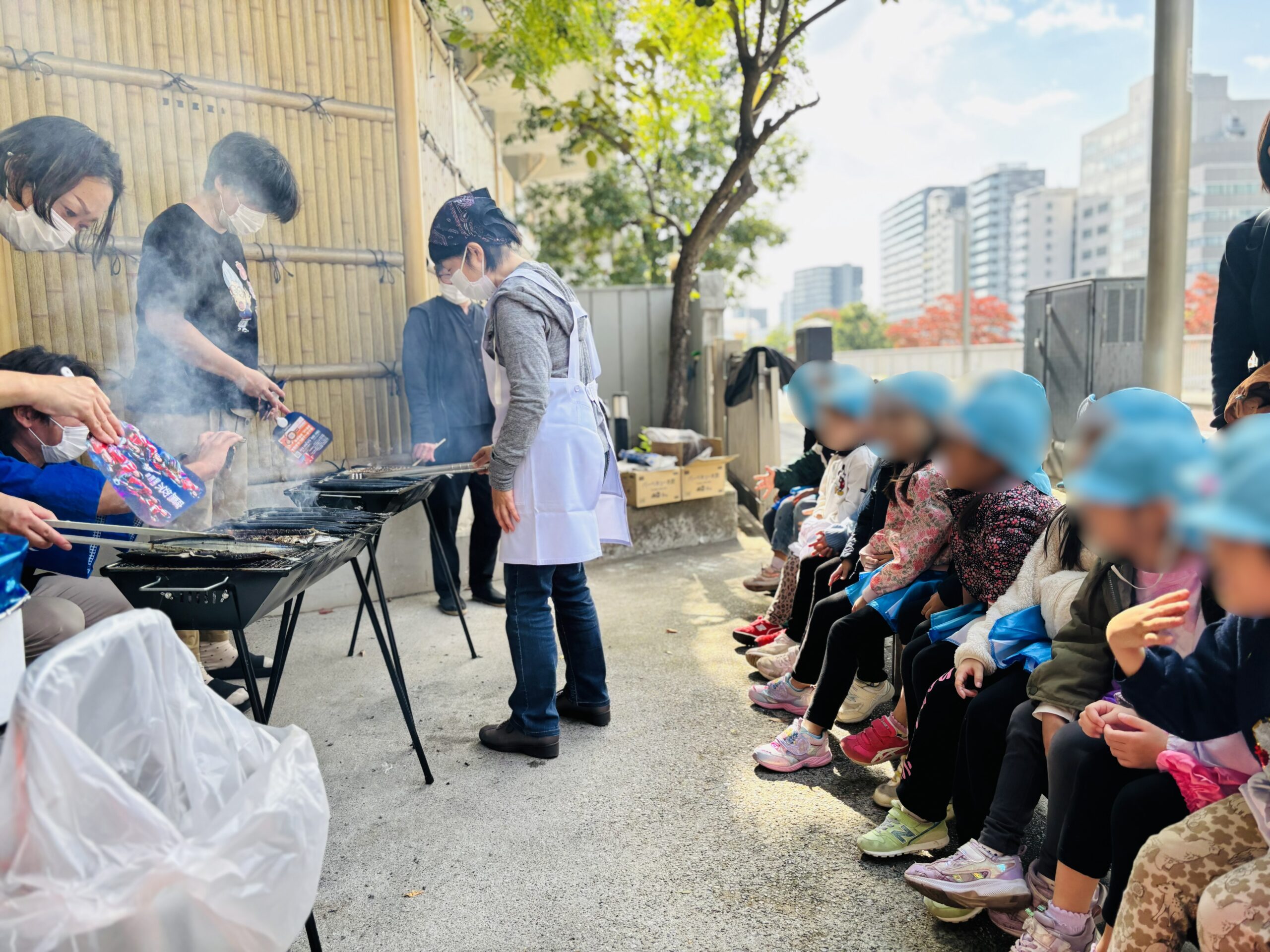 一方、玄関前では絶好の秋空のもと、さんま焼きの準備が進行。