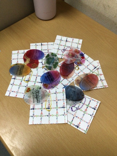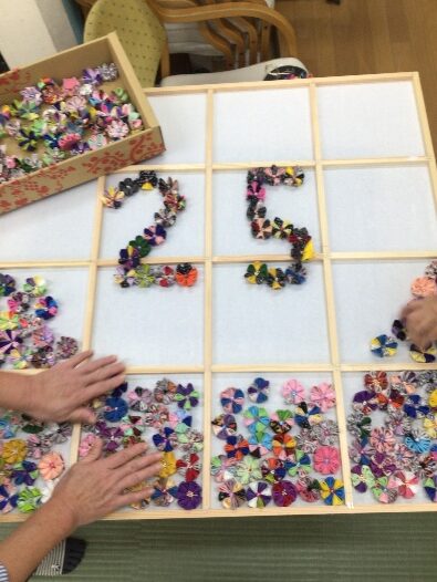 壁面に「25」のつまみ細工の作品を作成し、記念品の手作りキーホルダーを贈呈しました。