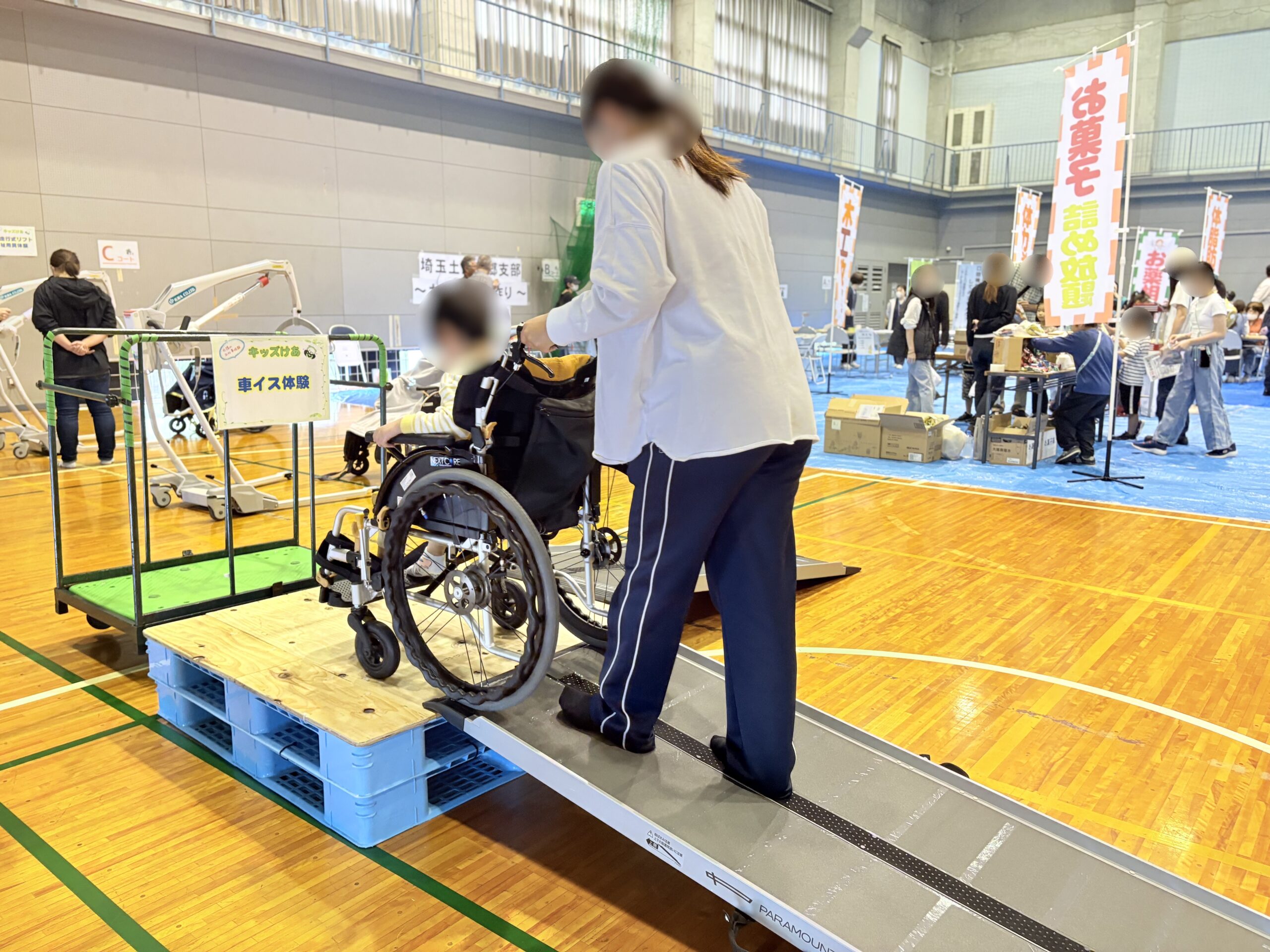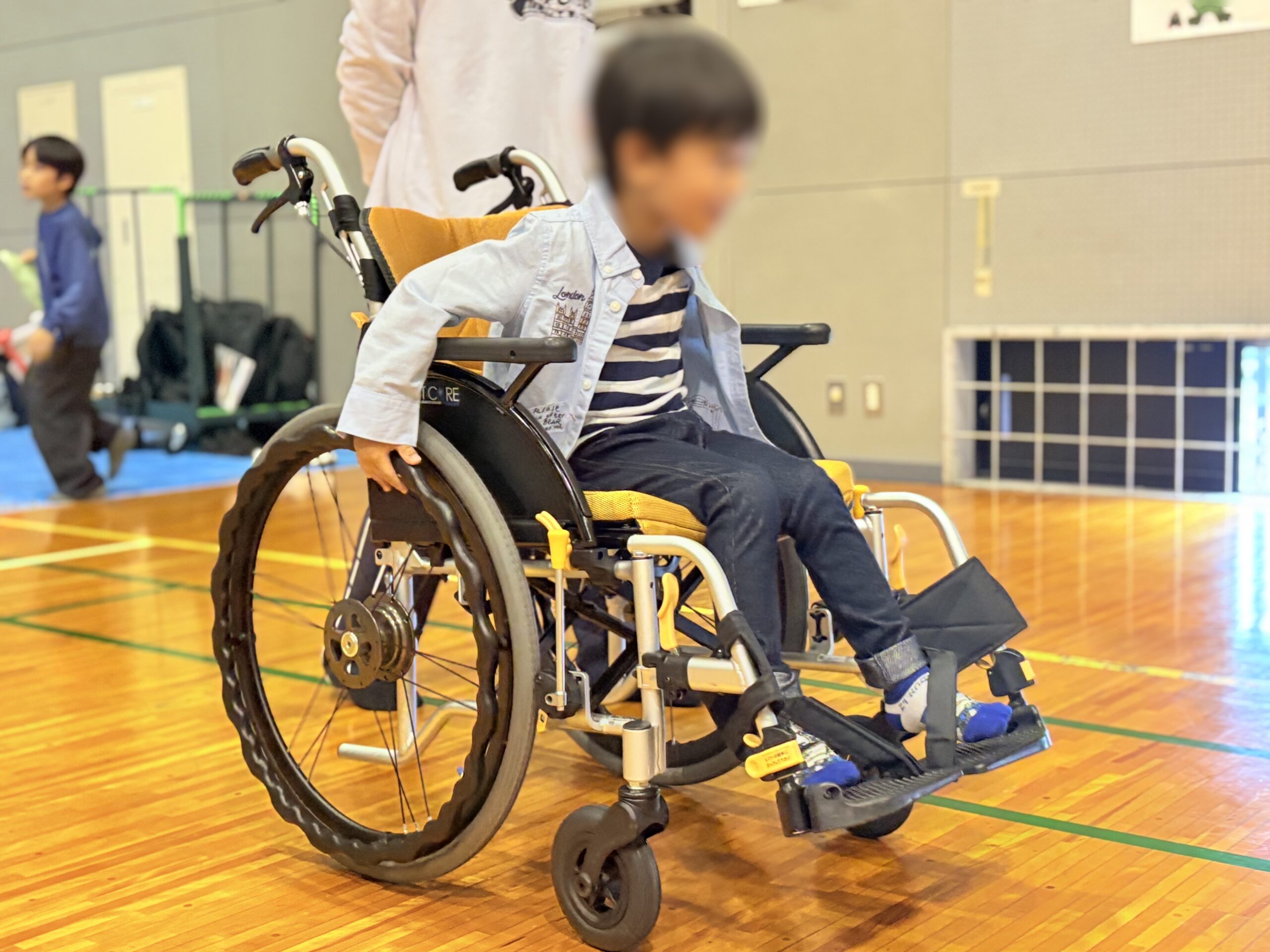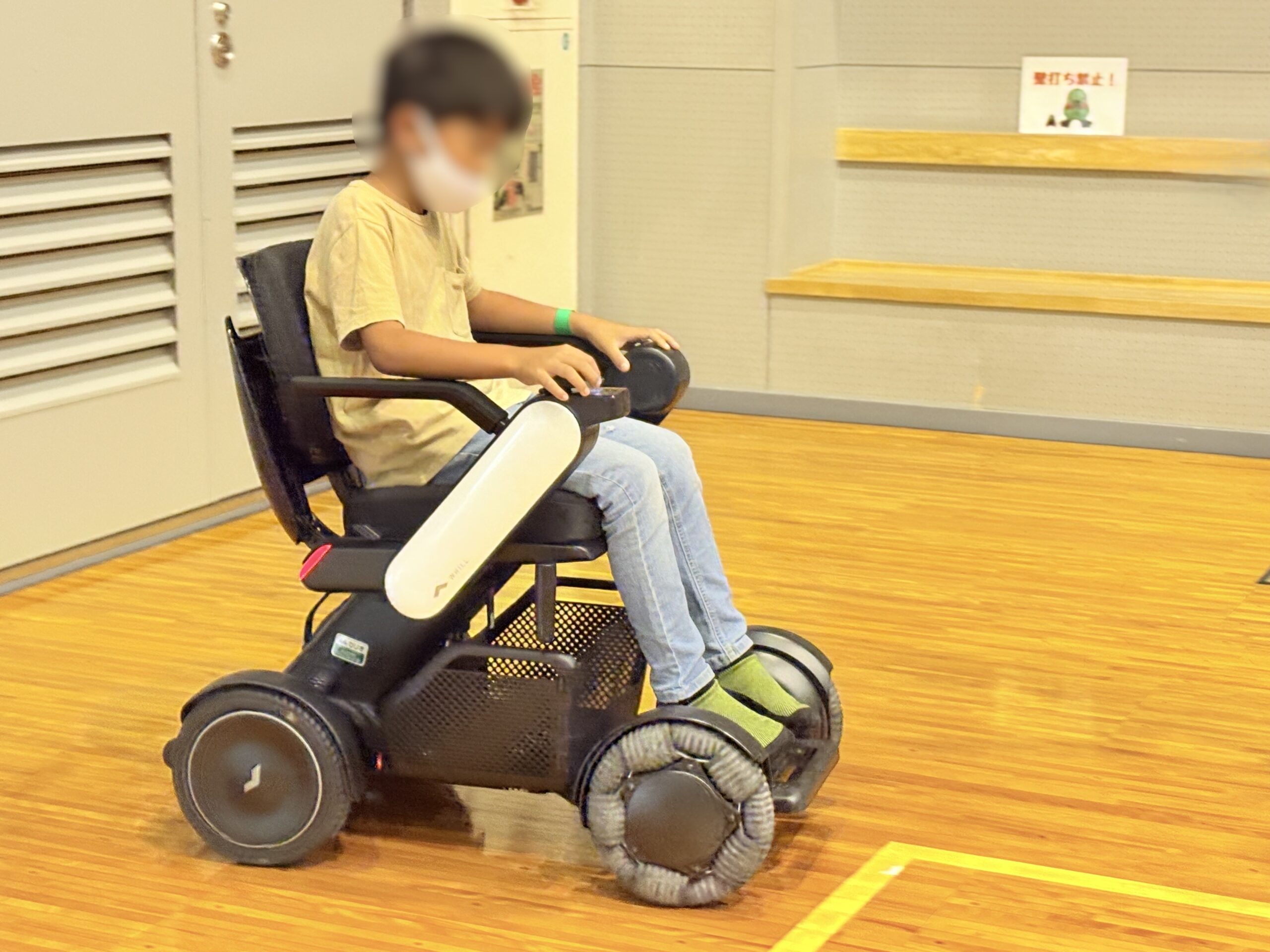 電動車いすの体験です。右手のレバー操作でスイスイ進む感覚に、子どもたちも夢中でした✨