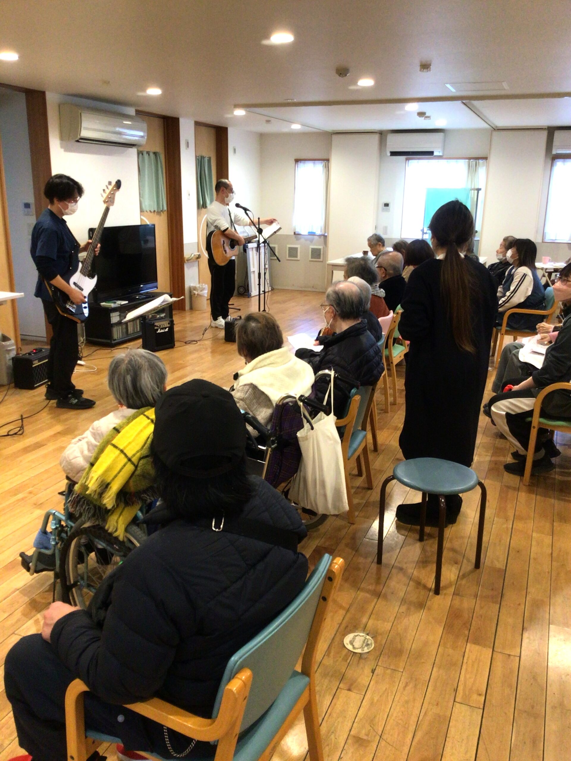 職員が演奏するギターとベースに合わせて歌を歌いみんなで手拍子足拍子。