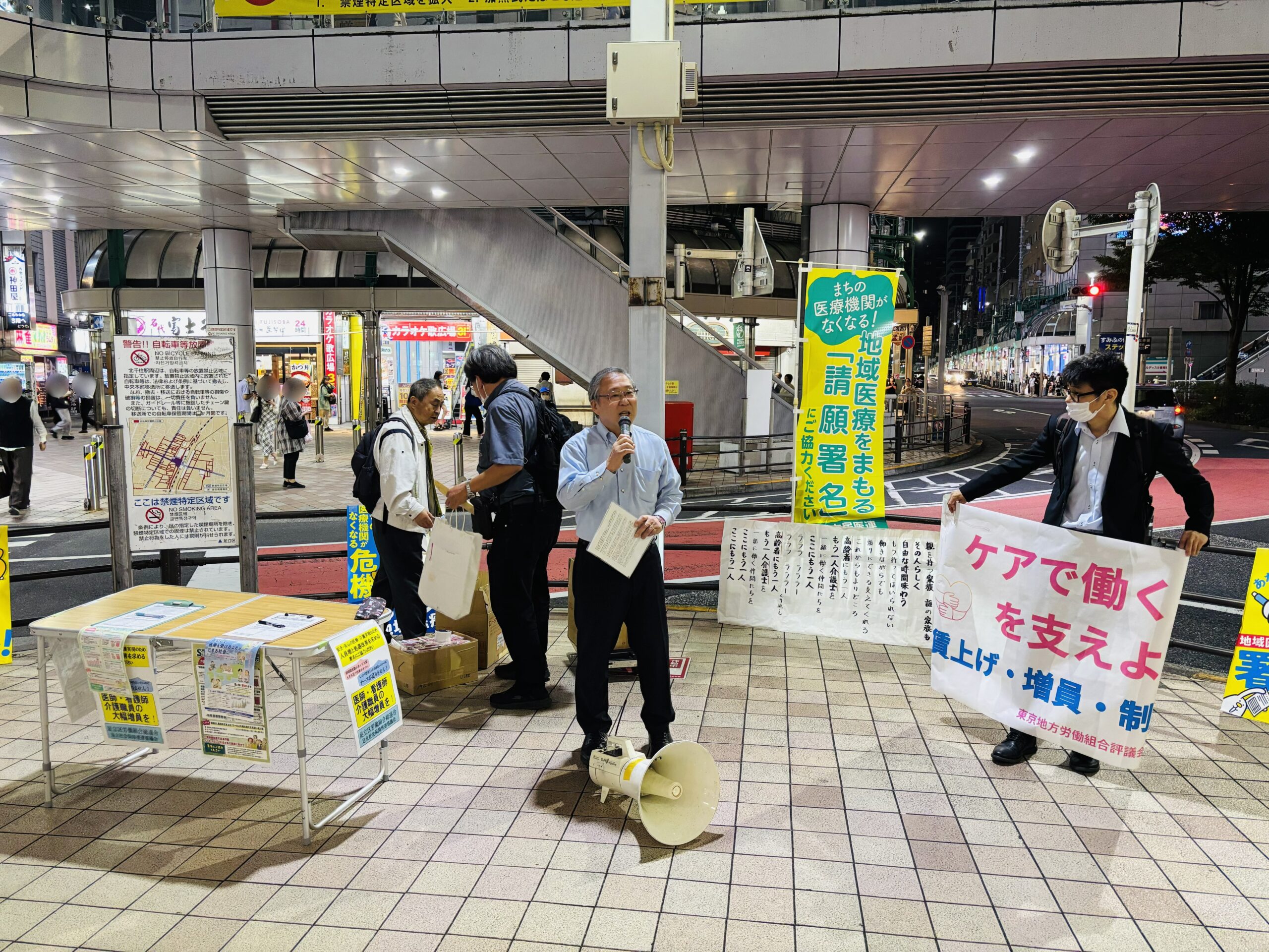 10月10日(金)18:00~、足立区・北千住駅前にて、足立区苦労連・足立社保協主催による「医療・介護崩壊をくい止める」北千住駅前宣伝行動を行いました。