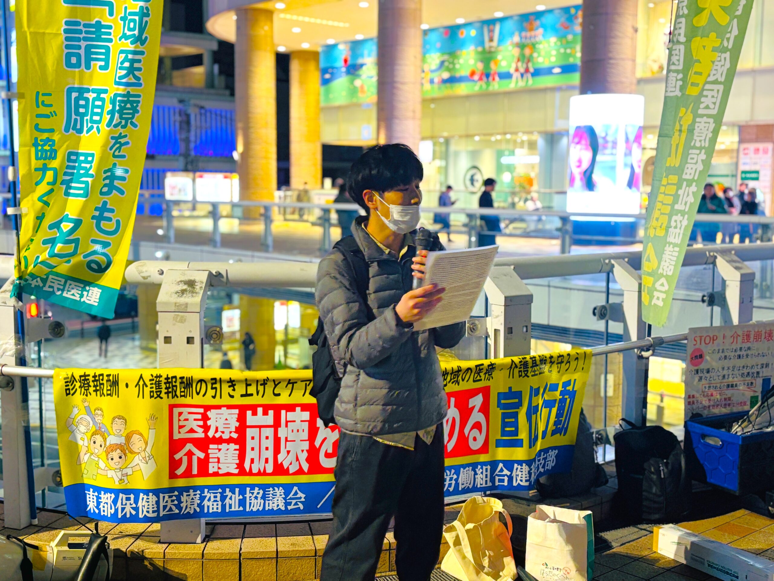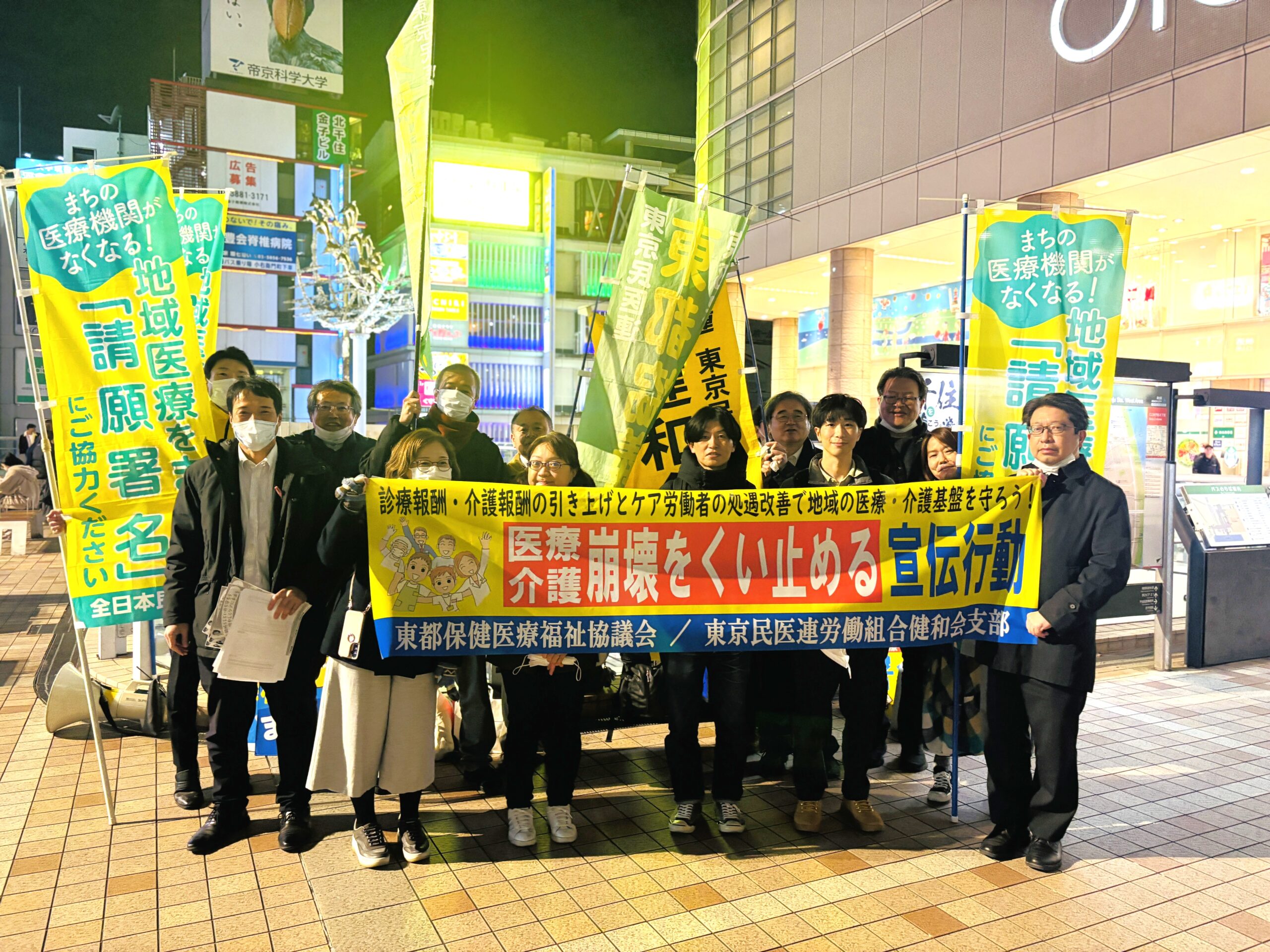 12月18日(木)18:00~、足立区・北千住駅前にて、東都保健医療福祉協議会、東京民医連労働組合健和会支部主催による、『医療介護崩壊をくい止める宣伝行動』を行いました。